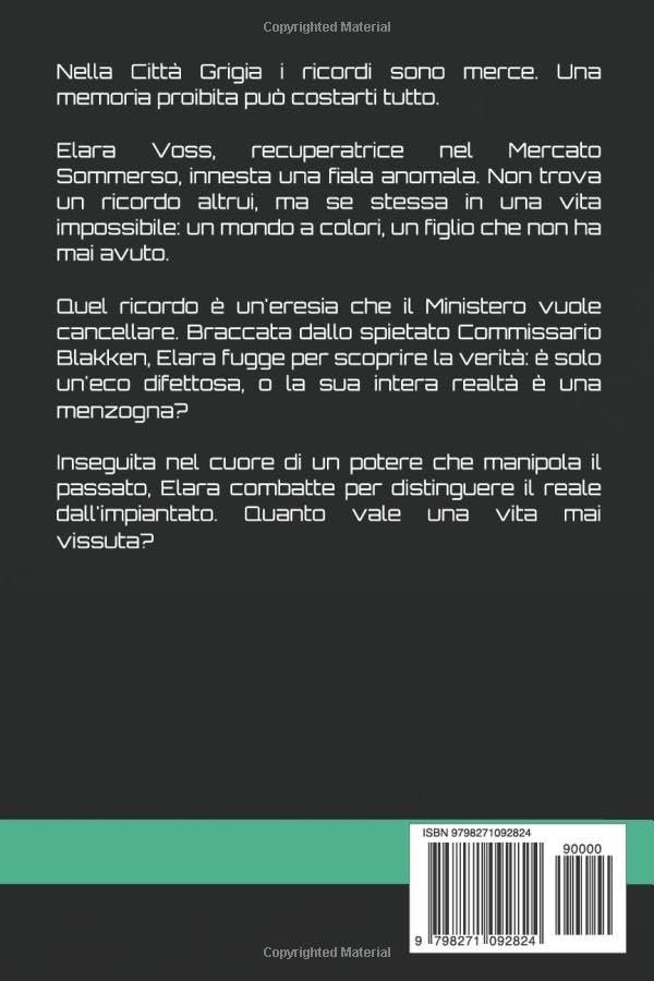 Nella Città Grigia, i ricordi non sono più un dono naturale: sono un bene di lusso, filtrato, sterilizzato e venduto dal potere che controlla ogni aspetto della vita. Elara Voss, recuperatrice clandestina, sopravvive dando la caccia a memorie proibite nel Mercato Sommerso, un bazar illegale nascosto nelle viscere umide della metropoli. Finché una fiala anomala, pulsante di una luce innaturale, cambia per sempre la sua esistenza.