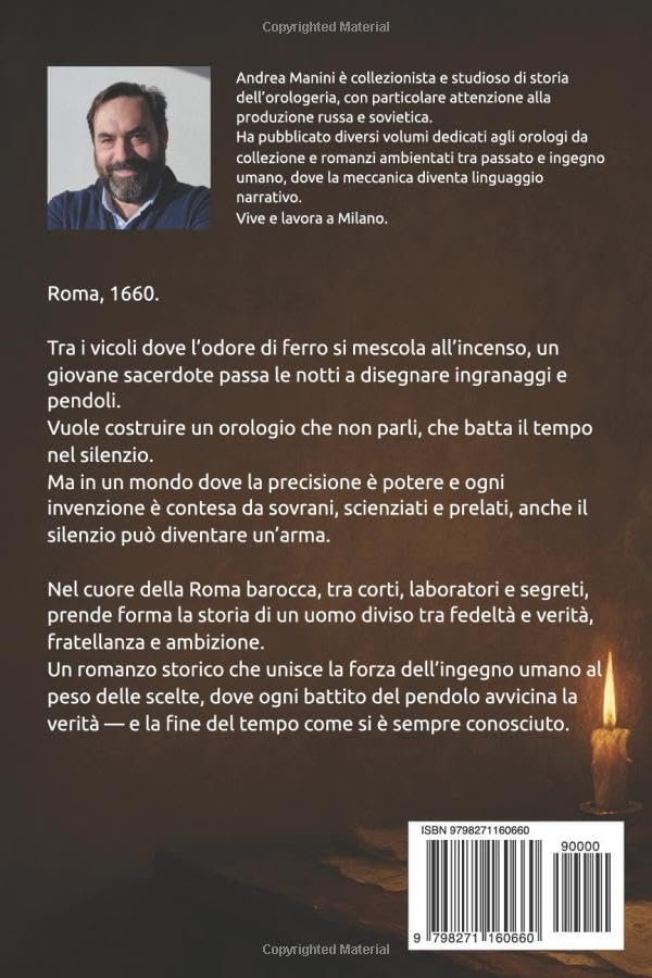 Ambientato durante il pontificato di Alessandro VII, il romanzo segue il percorso di un uomo diviso tra lealtà fraterna e verità intellettuale. Nel silenzio dell’officina, tra pergamene colme di calcoli, pendoli sperimentali e meccanismi che aspettano solo la giusta intuizione, nasce l’idea dell’orologio muto: un dispositivo rivoluzionario che promette di cambiare il rapporto tra tempo, scienza e fede.