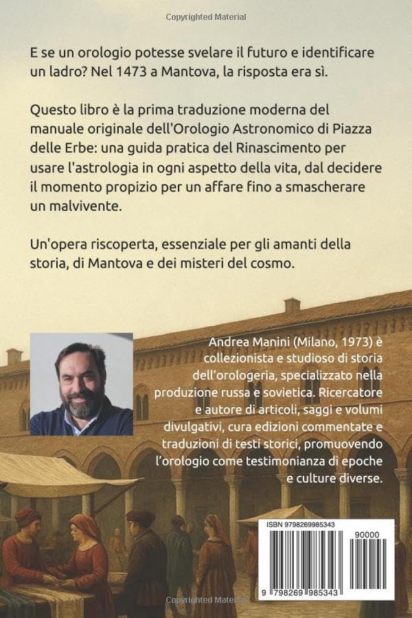 Questa edizione moderna rende accessibile l’opera originale, traducendola fedelmente dal volgare del Quattrocento e arricchendola con un apparato critico completo. Il lettore può così seguire passo dopo passo l’uso e l’interpretazione dell’orologio di Piazza delle Erbe: una macchina capace non solo di indicare ore, fasi lunari, segni zodiacali e posizioni astrali, ma anche di orientare decisioni politiche, economiche e personali secondo la cosmologia del tempo.
